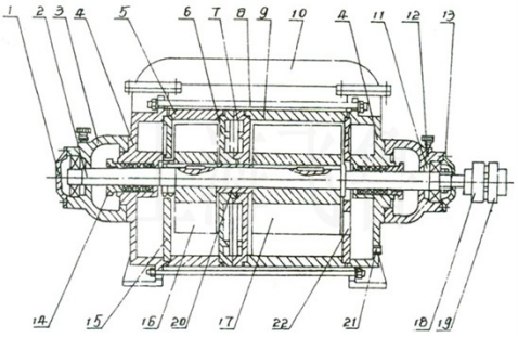 1、后軸承壓蓋 2、軸 3、軸承架 4、前后端蓋 5、短泵體 6、中間壁(B) 7、中間壁(A) 8、拉緊螺栓 9、長泵體 10、連通管 11、調整墊 12、油杯 13、前軸承壓蓋 14、填料壓蓋 15、后蓋園盤 16、短葉輪 17、長葉輪 18、泵聯軸器 19、電機聯軸器 20、軸套 21、進水孔 22、前蓋園盤