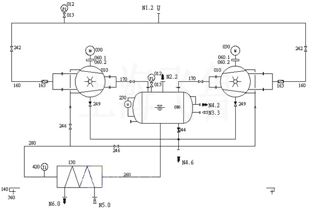 工作液用于形成真空泵的液環(huán)。工作液通過管線(260),自分離器(080)流入換熱器 (130),冷卻后通過管線(280)返回真空泵。在此過程中,壓縮產(chǎn)生的熱及隨被抽氣體 帶入的熱被釋放掉。該閉環(huán)機(jī)組設(shè)計(jì)為兩臺(tái)真空泵(010)共用一臺(tái)分離器(080)和一臺(tái)換熱器(130)(真空泵一開一備),一臺(tái)真空泵工作時(shí),備用泵的吸氣管路和排氣管路上的蝶閥須關(guān)好。正常多采用一臺(tái)真空泵(010)配套一臺(tái)分離器(080)和一臺(tái)換熱器(130)。